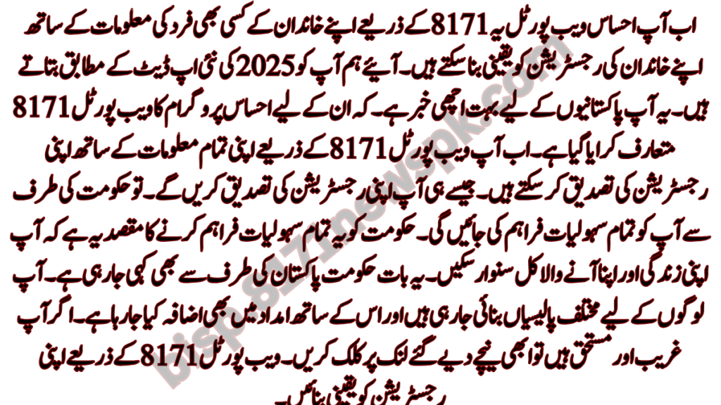 So all the facilities will be provided to you by the government. The purpose of providing all these facilities to the government is that you can improve your life and your tomorrow. This is also being said by the government of Pakistan. Different policies are being made for you people and along with this the aid is also being increased. If you are poor and deserving, click on the link given below now. Ensure your registration through the web portal itself 8171.
