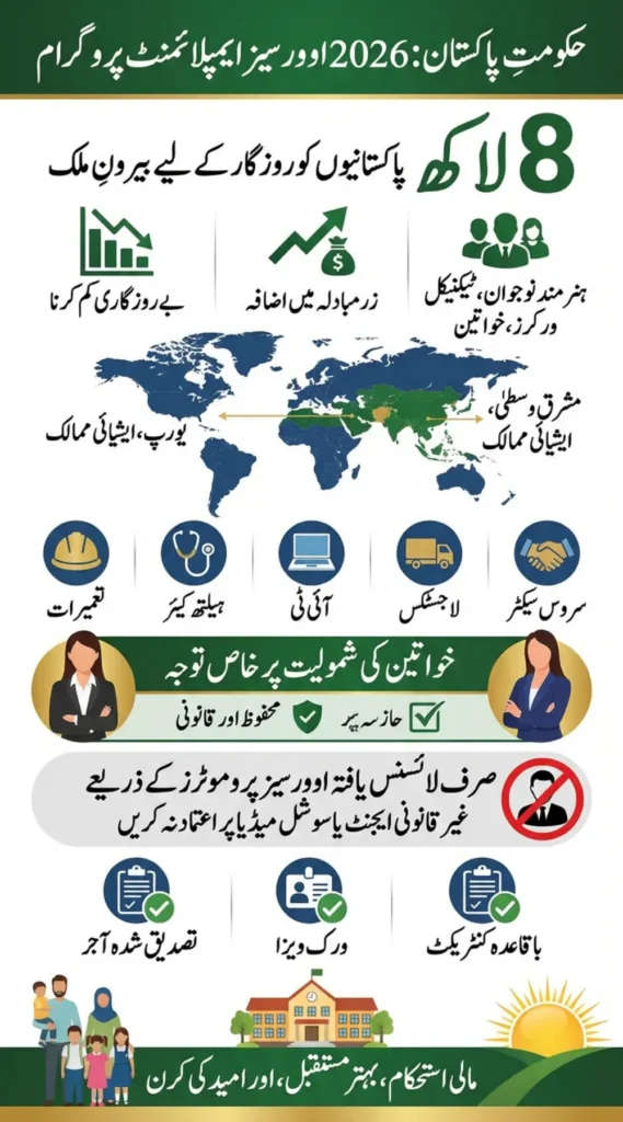 Pakistan government has announced a major overseas employment plan to send 800,000 Pakistanis abroad for jobs in 2026, creating new opportunities for skilled workers, youth, and women. The program focuses on safe and legal employment through licensed promoters, with demand coming from the Middle East, Europe, and Asia.