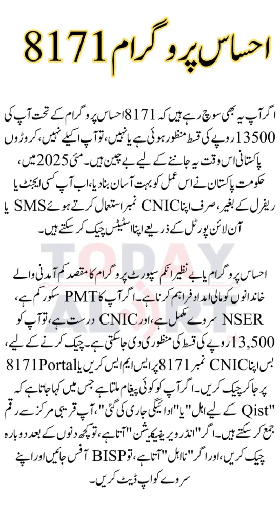 Ehsaas Program or Benazir Income Support Program (BISP) aims to provide financial assistance to low-income families. If your PMT score is low, NSER survey is complete, and CNIC is valid, then you may be approved for the Rs 13,500 installment. To check, just SMS your CNIC number to 8171 or visit 8171.bisp.gov.pk and check. If you get a message saying “Eligible for Qist” or “Payment Released”, you can collect the money from the nearest center. If “Under Verification” comes up, check again after a few days, and if “Not Eligible” comes up, visit the BISP office and get your survey updated.