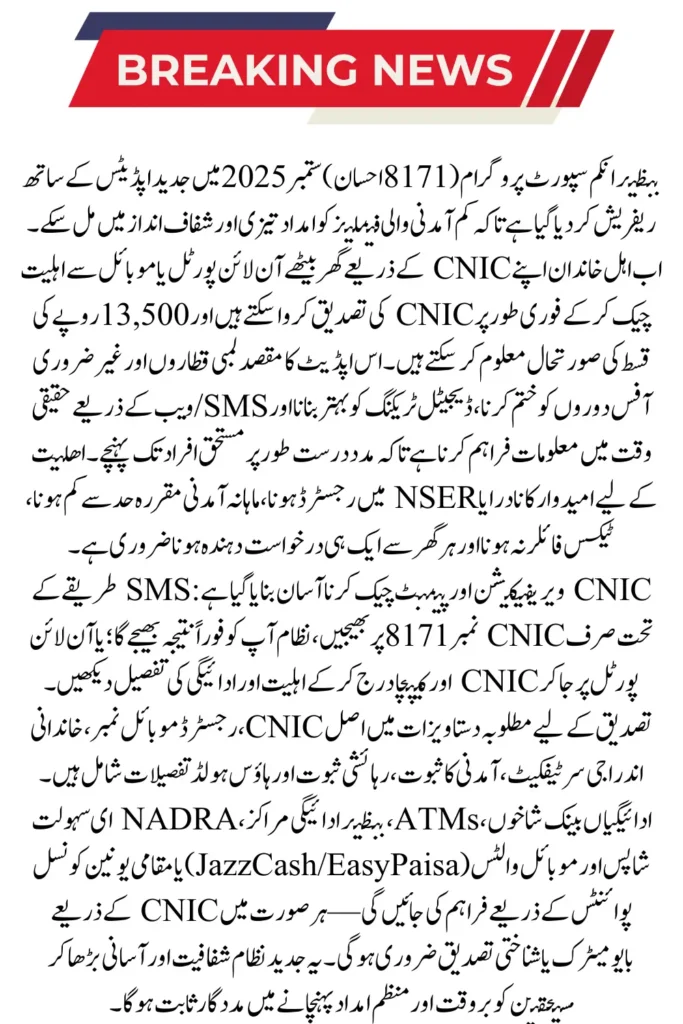 In September 2025, the 8171 Ehsaas Program has been refreshed with new features to make financial assistance faster and more transparent. Low-income families can now check eligibility, complete CNIC verification, and receive the payment of Rs. 13,500 more easily through the online portal or mobile devices.