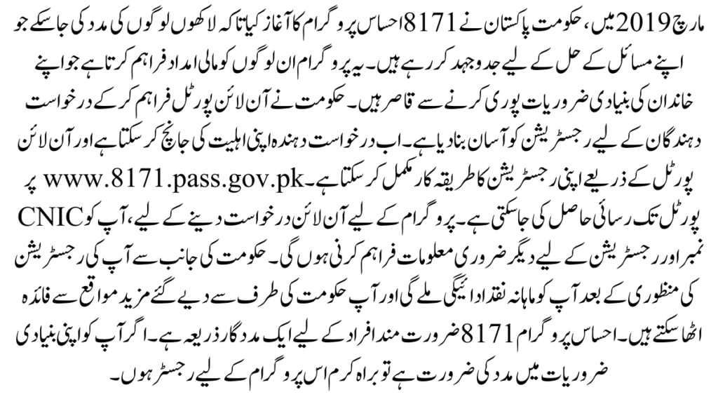 The main objective of 8171program is to eradicate poverty in Pakistan and provide financial assistance to the weaker sections of society. You can get financial assistance by registering for the program.