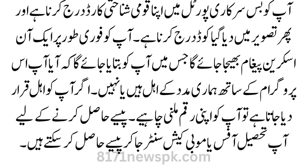All you have to do is enter your National Identity Card in the official portal and then enter the code given in the image. You will immediately be sent an on-screen message letting you know whether or not you are eligible for our assistance with this program. If you are declared Eligible then you should get your money. To get money you can go to Tehsil Office or MobiCash center to get your money.