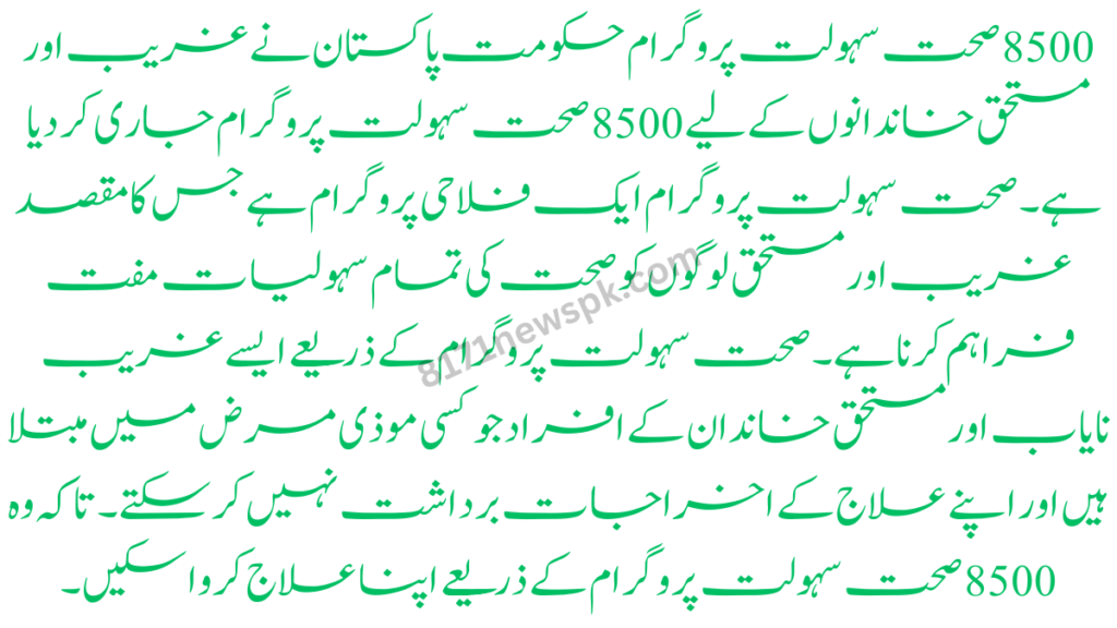 8500 Sehat Sahulat Program The government of Pakistan has released the 8500 Sehat Sahulat Program for poor and deserving families. Sehat Sahulat Program is a welfare program that aims to provide all health facilities free of cost to poor and deserving people. Through the Sehat Sahulat Program, such poor rare, and deserving family members who are suffering from any fatal disease and cannot afford their treatment expenses. You can also Read: