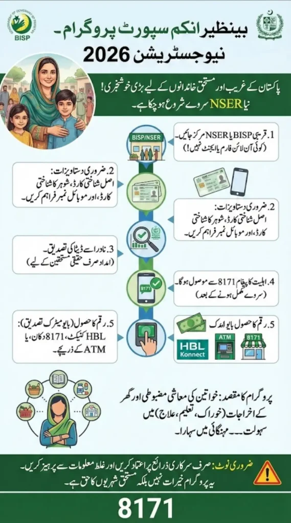 Eligible families can check their status through 8171, register at nearby BISP centers, and receive payments via HBL Connect or registered shops. This 2026 update focuses on transparency, NADRA verification, and reaching genuinely poor families without agents or fees.