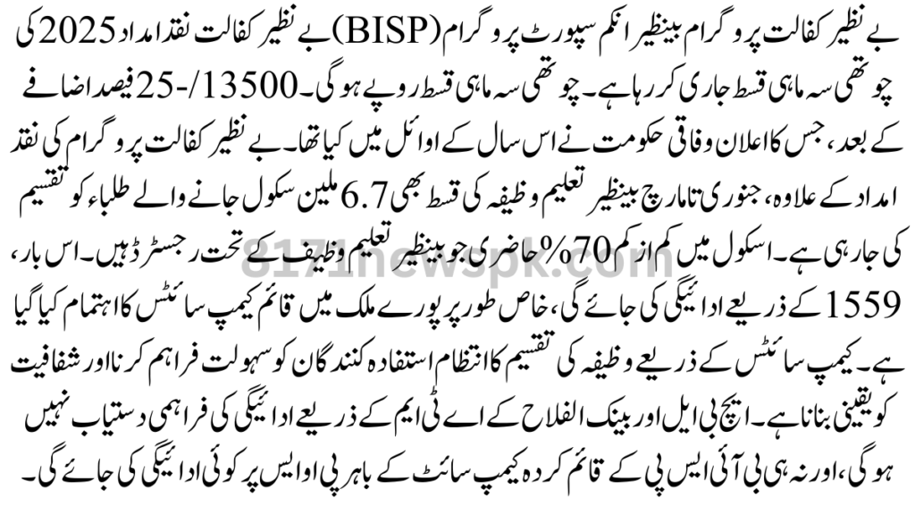 Benazir Kafalat Program: The Benazir Income Support Program (BISP) is releasing the 4th quarterly tranche of Benazir Kafalat cash assistance 2025. 4th quarterly tranche will be Rs. 13500/- after a 25% increase, which was announce by the Federal Government early this year.
