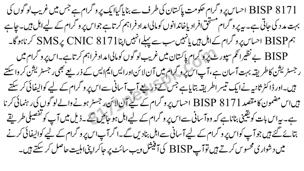 BISP 8171 Ehsaas program is a program create by the government of Pakistan in which poor people are greatly assist . This program provides financial assistance to deserving individuals or families who qualify for this program. Whether we are eligible for the BISP Ehsaas program or not first of all they have to SMS their CNIC to 8171.
