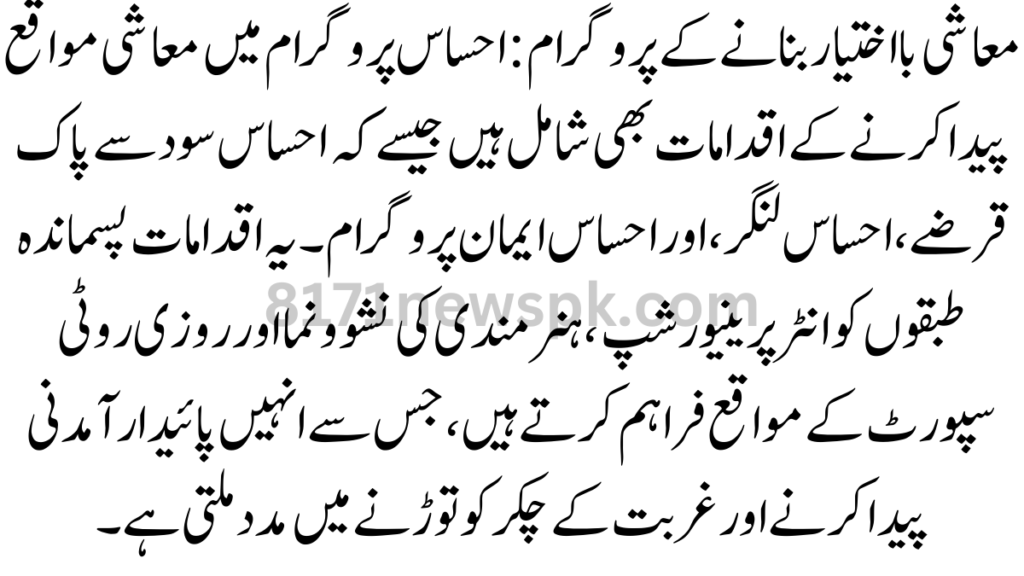 - Economic Empowerment Programs: The Ehsaas program also includes initiatives to create economic opportunities such as Ehsaas interest-free loans, Ehsaas Langar, and Ehsaas Imman programs. These initiatives provide opportunities for entrepreneurship, skills development, and livelihood support to marginalized communities, helping them generate sustainable incomes and break the cycle of poverty.