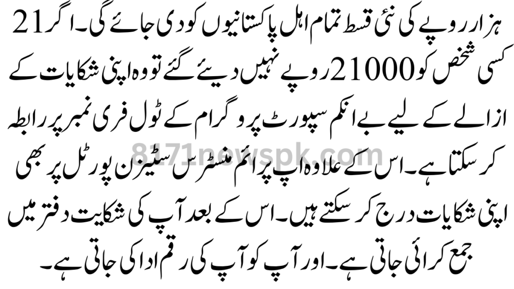 The new installment of Rs 21 thousand will be given to all eligible Pakistanis. If a person is not given Rs 21000, he can contact the toll free number of Bay Income Support Program for redressal of his grievances.