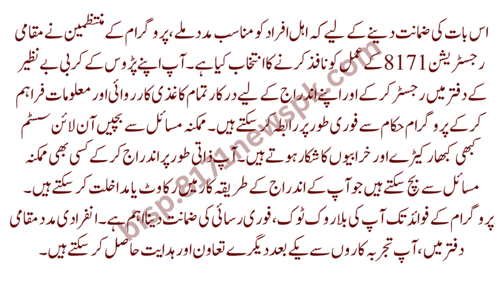In order to guarantee that eligible individuals receive appropriate help, the programme administrators have chosen to implement a localized registration 8171 process. You can communicate with programme authorities immediately by registering at your neighborhood Krabi Benazir office and supplying all the paperwork and information required for your enrollment. Steer clear of potential problems Online systems are occasionally vulnerable to bugs and malfunctions. You can steer clear of any potential problems that might impede or interfere with your enrollment procedure by registering in person. It’s critical to guarantee your unhindered, instant access to the program’s benefits. Individual Support At the local office, you can get one-on-one support and direction from experienced