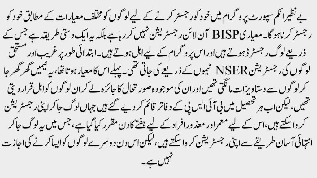 To register themselves in the Benazir Income Support Program, people have to register themselves according to various criteria. Standardized BISP is not doing online registration but it is a manual method through which people are registered and eligible for this program.