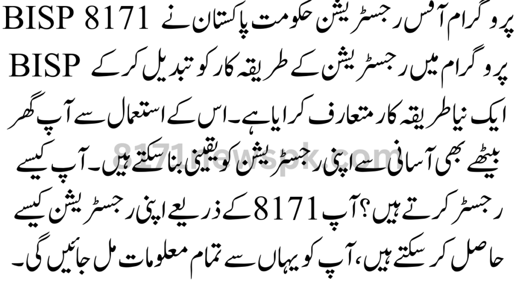 BISP 8171 Program Office Registration The government of Pakistan has introduced a new procedure by changing the procedure of registration in the BISP program. Using this you can easily ensure your registration even sitting at home. How do you register?