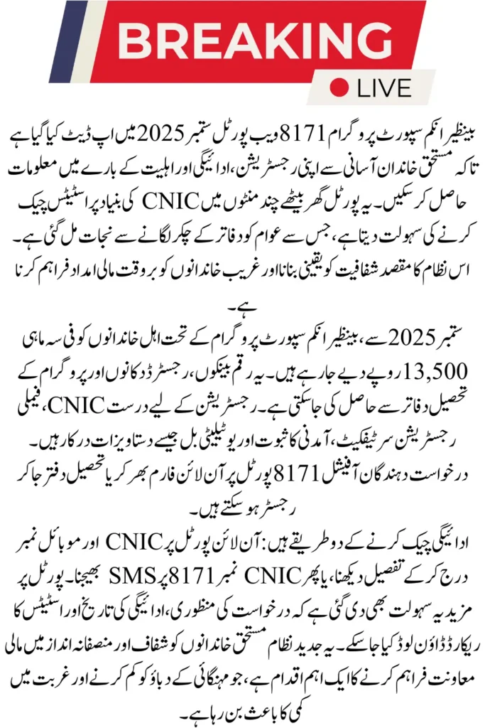 The BISP 8171 web portal has been upgraded in September 2025 to simplify the process of checking eligibility, payments and registration for families. This online platform is designed to provide instant information without visiting offices, saving time and effort for eligible families.
