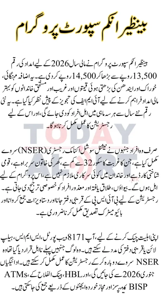 The increase in BISP payment from 13,500 to 14,500 is a welcome step for families hit hard by inflation. If you or someone you know is struggling financially, now is the right time to register for this program. Complete your NSER survey, check your poverty score, and stay updated via the 8171 portal or helpline.