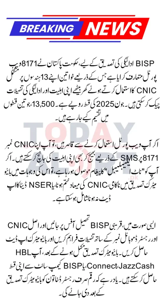 Also Read: 8171 CNIC Verification BISP Payment June 2025 via BISP Tehsil office