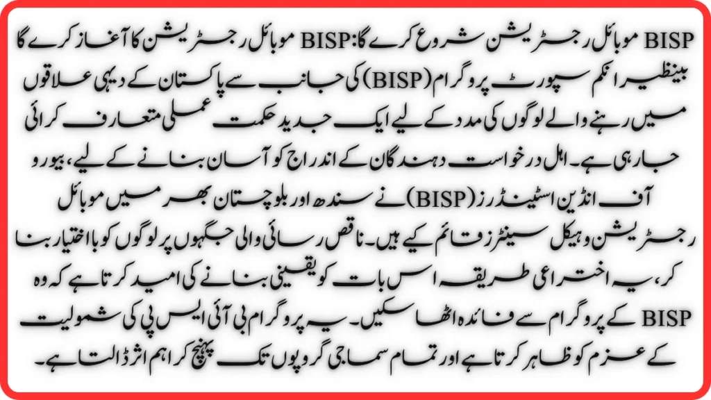 BISP to launch Mobile Registration :BISP to launch Mobile Registration An innovative strategy is being introduced by the Benazir Income Support Programme (BISP) to assist people living in rural areas of Pakistan. To make it easier for qualified applicants to enroll, the Bureau of Indian Standards (BISP) has set up Mobile Registration Vehicle Centres across Sindh and Balochistan. By empowering people in places with poor accessibility, this innovative approach hopes to make sure that they can take advantage of BISP’s programme. This programme demonstrates BISP’s commitment to inclusivity and having a significant impact by reaching out to all societal groups.