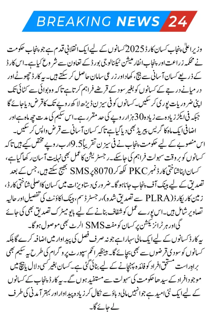 The card offers interest-free loans of up to Rs. 1.5 lakh per season, with a limit of Rs. 30,000 per acre, especially for landowners owning 1 to 12.5 acres. Valid for six months with a grace period of one month, the scheme ensures repayment flexibility. With an investment of Rs. 9.5 billion per season, this project not only increases crop production but also promotes financial inclusion by sending free SMS alerts for every transaction. It is a game changer for Punjab farmers, helping them from sowing to harvesting.