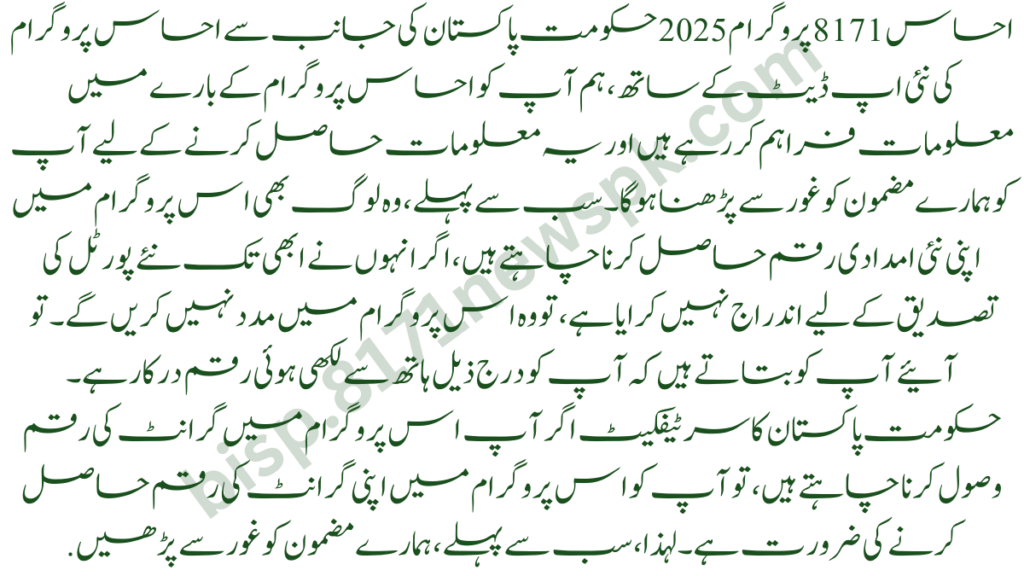 Ehsaas 8171 Program 2025: With Ehsaas Program New Update from Government of Pakistan, we are giving you information about Ehsaas Program and you have to read our article carefully and carefully to get this information. First of all, those people also want to get their new aid money in this program, if they have not yet register for the new portal verification, then they will not aid in this program.
