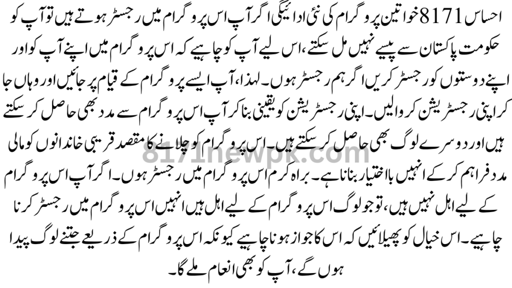 Ehsaas 8171 Women Program New Payment If you register in this program, you can not get money from the government of Pakistan, so you should register yourself and your friends in this program if we register. So, you go to the establishment of such a program and get your registration done go there. By ensuring your registration, you can also get help from this program and others can also get it.