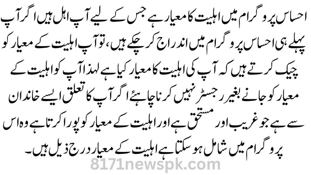 The Ehsaas program has eligibility criteria which you are jug to eligible If you are already enroll in the Ehsaas program, you check the eligibility criteria to see what your eligibility criteria is