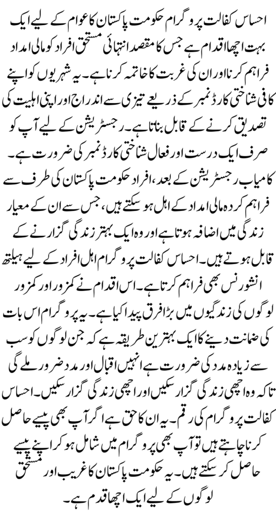Ehsaas Kafalat program is a very good initiative of the government of Pakistan for the people which aims to provide financial assistance to the most deserving people and eradicate their poverty. It also enables citizens to register quickly and verify their eligibility through their Sufficient Identity Card Number. All you need for registration is a valid and active Identity Card number.
