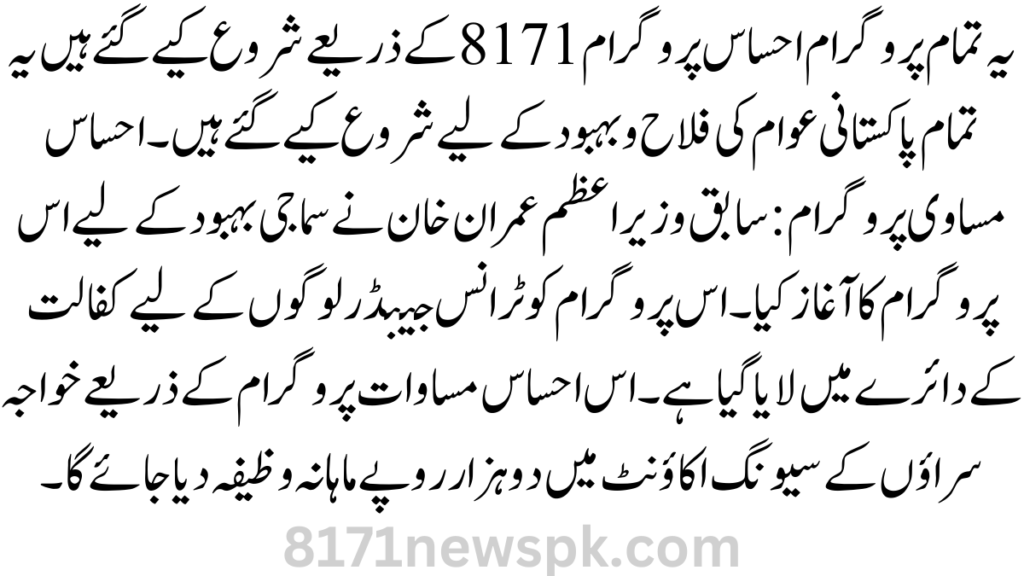 All these programs are launched through Ehsaas Program 8171 These are initiated for the welfare of all Pakistani people. Ehsaas Masawaat Program: Former Prime Minister Imran Khan started this program for social welfare. This program has been brought under the ambit of sponsorship for transgender people. Through this Ehsaas Masawaat Program, a monthly stipend of two thousand rupees will be provided in the savings account of transgender people.