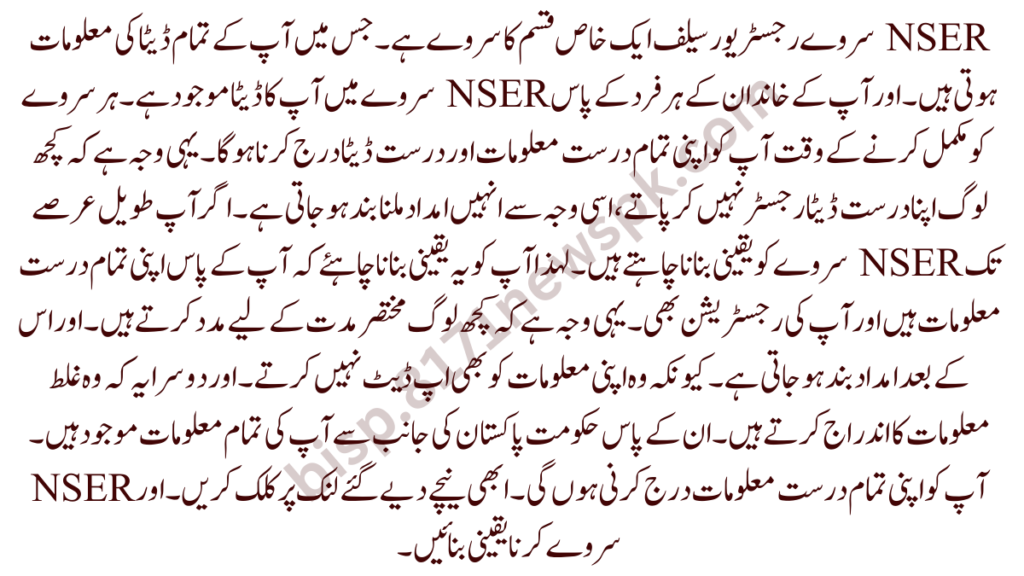 Therefore, NSER survey has made mandatory so that your money does not stop and thus you continue to get financial assistance. Remember, you will give the NSER survey online registration form in the office. After fill it you will return to the office and after that, you will be inform about all the details if you go to the Benazir income support program and you are call NSER survey.