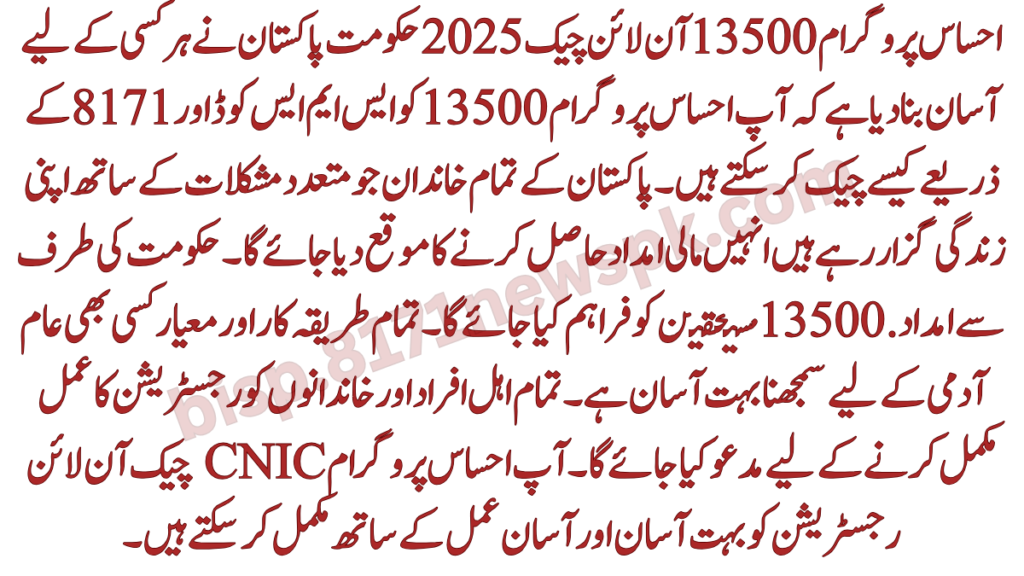 احساس پروگرام 13500 آن لائن چیک 2025 حکومت پاکستان نے ہر کسی کے لیے آسان بنا دیا ہے کہ آپ احساس پروگرام 13500 کو ایس ایم ایس کوڈ اور 8171 کے ذریعے کیسے چیک کر سکتے ہیں