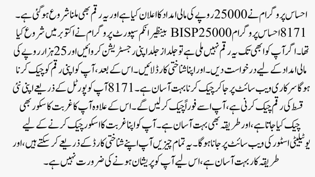 احساس پروگرام سے 25,000 آپ CNIC نمبر استعمال کر کے 8171 پر آسانی سے SMS کر سکتے ہیں۔ آپ کی احساس 25000 رقم آپ کے بینک اکاؤنٹ میں منتقل کر دی جائے گی۔ آپ ATM مشین سے احساس پروگرام 25000 کیش نکال سکتے ہیں۔