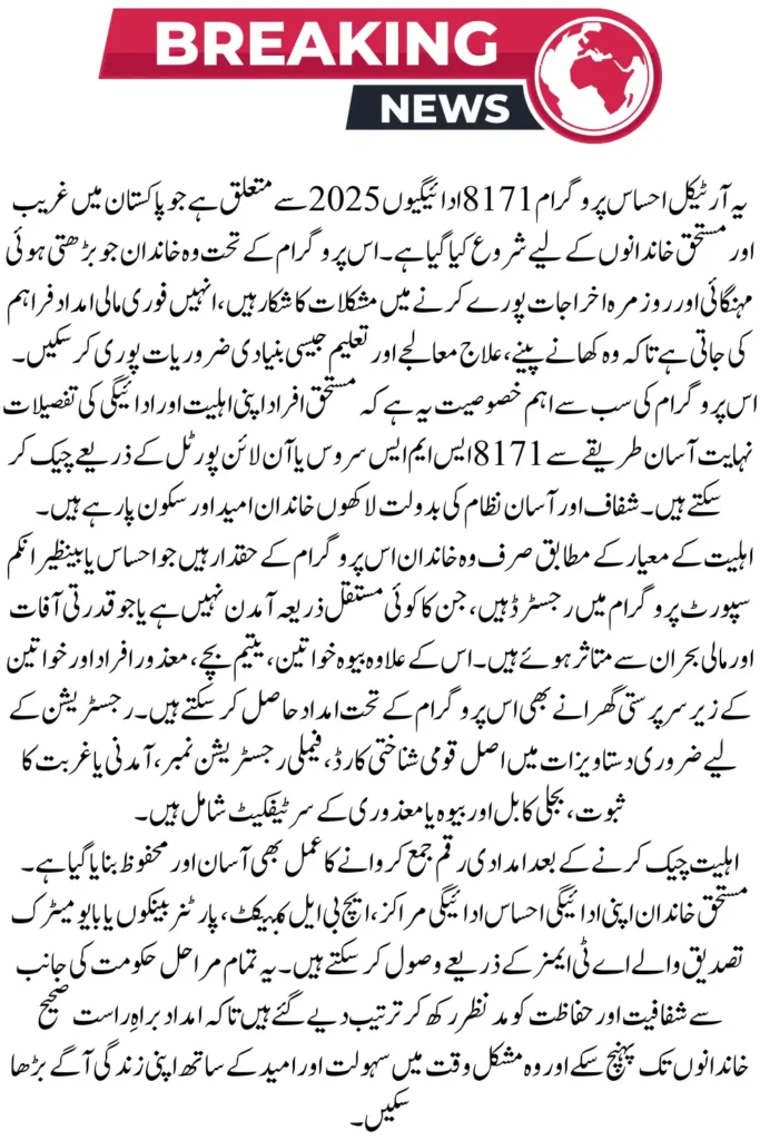 The Ehsaas Program 8171 in September 2025 is designed to help poor and deserving families who are unable to meet their daily expenses. Only those who meet the basic eligibility criteria can apply and receive financial assistance.