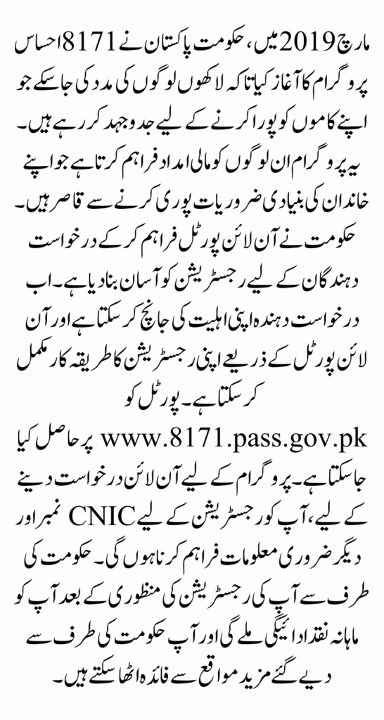 احساس پروگرام کا نیا CNIC رجسٹریشن: 8171 احساس پروگرام کا ہدف نقد رقم کی منتقلی، خوراک کی امداد اور اسکالرشپ جیسی سرگرمیوں کے ذریعے عدم مساوات کو کم کرنا اور غربت کا خاتمہ کرنا ہے۔ BISP 8171 ویب پورٹل، جو اس کی بہت سی خدمات میں سے ایک ہے، اہل افراد کو مالی مدد کے لیے آن لائن رجسٹر کرنے کی اجازت دیتا ہے۔ اس صفحہ پر، ہم بی آئی ایس پی 8171 ویب پورٹل کے ذریعے 2024 کے پروگرام میں احساس پروگرام کے لیے رجسٹر ہونے کا طریقہ دیکھیں گے۔