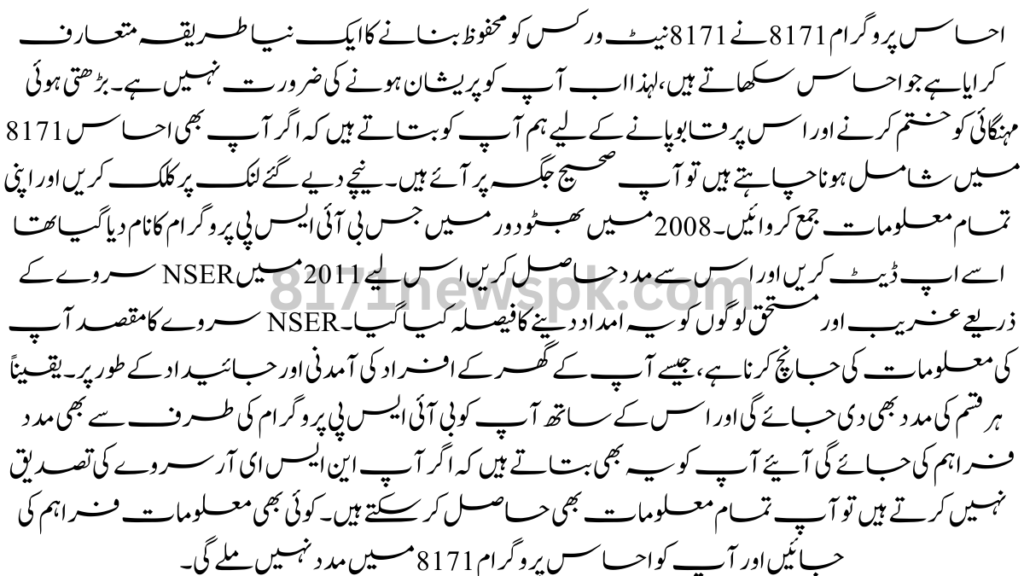 Ehsaas Programme 8171 has introduced a new way to secure 8171 networks that teach Ehsaas, so now you don’t need to worry. to eliminate and control rising inflation, let us tell you that if you also want to join Ehsaas 8171, you have come to the right place. Click on the link below and submit all your information. Update and get assistance from the BISP program it was named in the Bhutto era in 2008 so it was decided to give this assistance to poor and deserving people through the NSER survey in 2011.