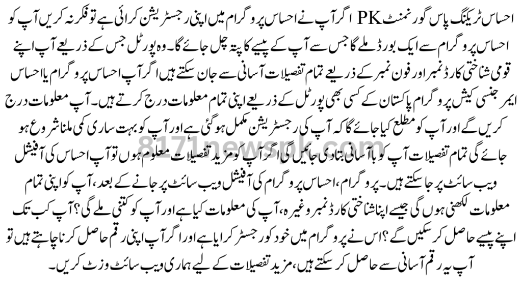 All the details are give on the portal, on the portal you will be to what is your registration, and how much money you will get, complete details will be place in front of you, if you get the order of the Ehsaas program, all the information will be to to you. If you or anyone in your family is register in this program, check their eligibility