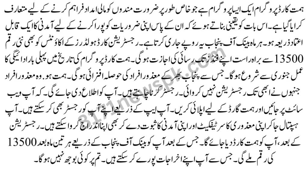 The Himmat Card Program is an important program. By ensuring that they have a reliable source of income to meet their need Every month. The Bank of Punjab issues these rupees. The accounts of the registration card holders will allowed to access their funds directly from the new amount 13500. For the first time in the history of the Himmat Card program, the payment process will start from January.