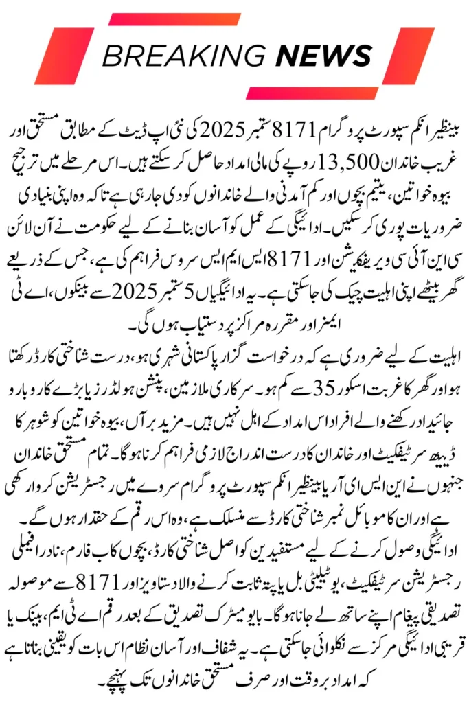 BISP 8171 has released the September 2025 payment update for poor and deserving families. Under this phase, eligible beneficiaries can receive up to Rs. 13,500 after completing CNIC and document verification. The government has also focused on widows, orphans and low-income households to ensure timely assistance.