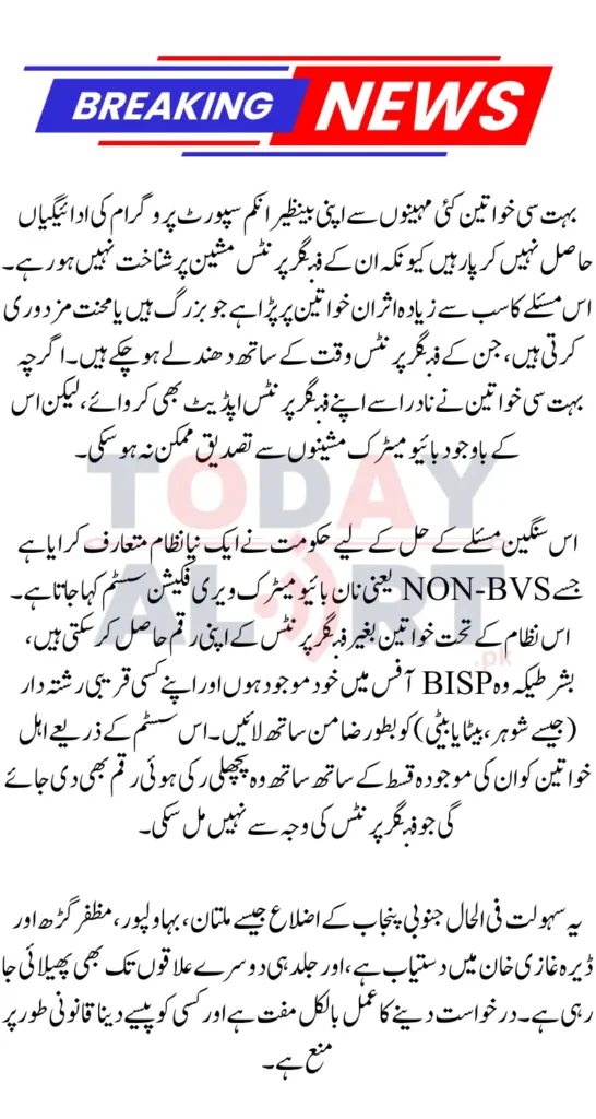 The NON-BVS system is a bold and much-needed step by the government to ensure no deserving woman is left behind due to technical fingerprint issues. If you’re registered with BISP, have done your fingerprint update at NADRA, but still can’t receive your payment, visit the nearest BISP office and apply under NON-BVS with a trusted guarantor.
