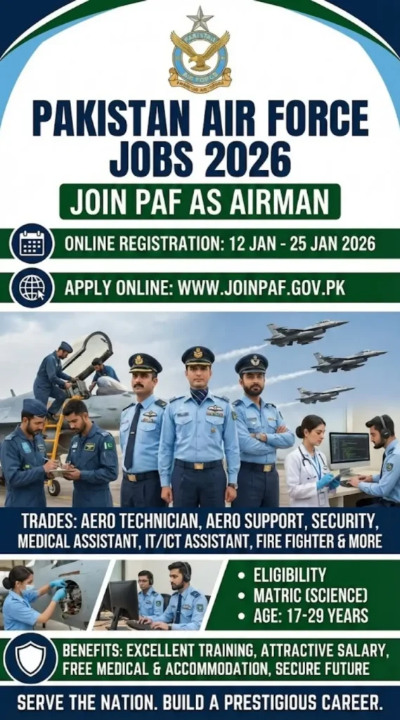 Pakistan Air Force PAF Jobs 2026 have officially been announced, offering a golden career opportunity for Matric (Science) qualified Pakistani youth. Online registration is open from 12 January to 25 January 2026 at www.joinpaf.gov.pk. PAF is recruiting Airmen in multiple technical and non-technical trades, including Aero Technician, Security, Medical Assistant, IT, and more.