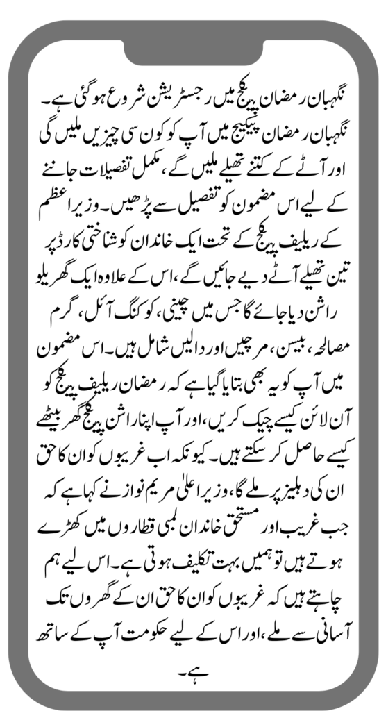 رمضان کے مقدس مہینے کے دوران، وزیر اعلیٰ مریم نواز کی قیادت میں پنجاب حکومت نے نگران راشن پروگرام 2024 کا آغاز کیا۔ 8070 مفت عطائی، اور نگران راشن جیسے اقدامات کا مقصد رمضان کے دوران لوگوں کی مدد کرنا، انہیں مفت پنجاب احساس راشن ریاضت اور چھوٹ کی پیشکش کرنا ہے۔ یوٹیلیٹی سٹورز پر ہر غریب خاندان کی خدمت۔ اگر آپ Neghban Rashan پروگرام کے تحت مفت راشن چاہتے ہیں، تو آپ کو صرف Neghaban پروگرام کی رجسٹریشن کے لیے جانا ہوگا اور جلد ہی آپ کو یہ سروس آپ کے دروازے پر مل جائے گی۔ اگر آپ Neghban مفت راشن اسکیم کے لیے آن لائن رجسٹریشن کے بارے میں جاننا چاہتے ہیں تو آخر تک ہمارے ساتھ جڑے رہیں۔