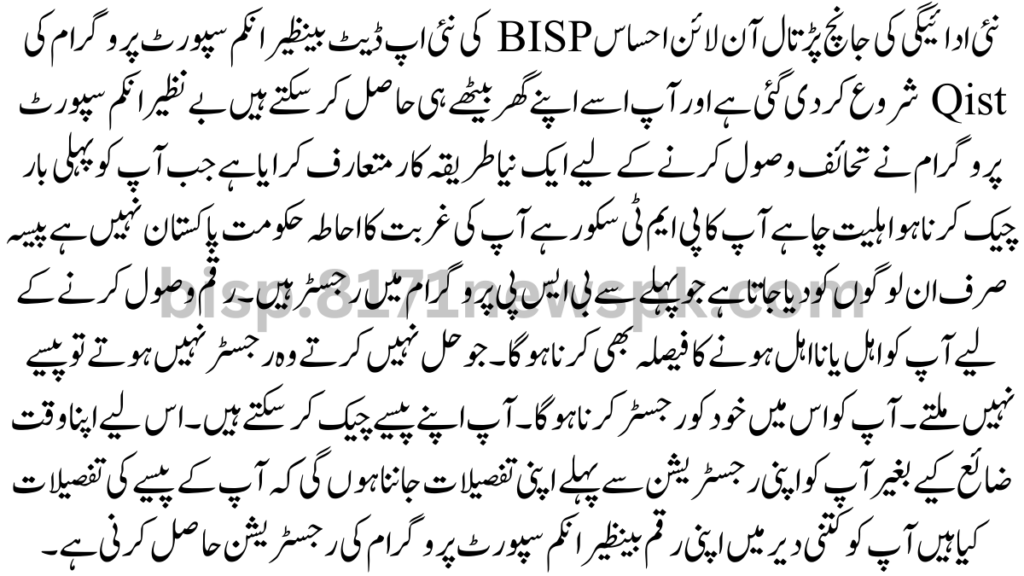 New Payment Check Online :Ehsaas BISP New Update The Qist of the Benazir Income Support Program has been launch and you can get it right from the comfort of your home Benazir Income Support Program has introduced a new procedure for receiving gifts When you first have to check your eligibility whether you PMT score is your poverty cover is the government of Pakistan not the money is give only to those who are already register in the BSP program. There are To receive money you also have to decide to be eligible or ineligible.