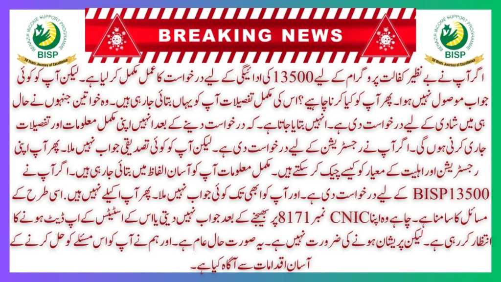 Then how can you check your registration and eligibility criteria. The complete information is being told to you in simple words. If you have applied for 13500 BISP. And you have not received any response yet. Then you are not alone. Facing similar problems. Whether she doesn’t respond after sending her CNIC number to 8171 or is waiting for her status to be updated. But there is no need to worry. This situation is common. And we have informed you about the easy steps to solve this problem.