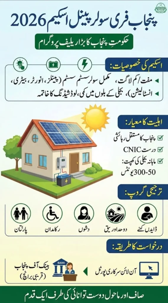 The Punjab Free Solar Panel Scheme 2026 is a government-backed initiative that provides complete solar power systems to eligible households mostly free, and in some cases highly subsidized.