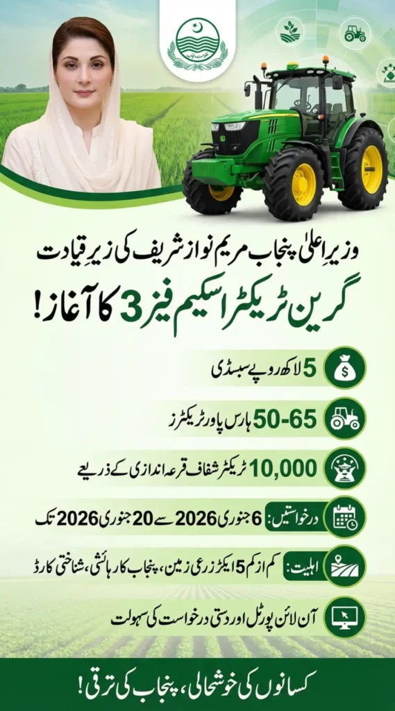 The Punjab Green Tractor Scheme Phase 3 is officially open for small and medium farmers across Punjab under the leadership of Maryam Nawaz Sharif. This phase offers a Rs 5 lakh subsidy on 50–65 HP tractors, with 10,000 units available through a transparent digital balloting system.