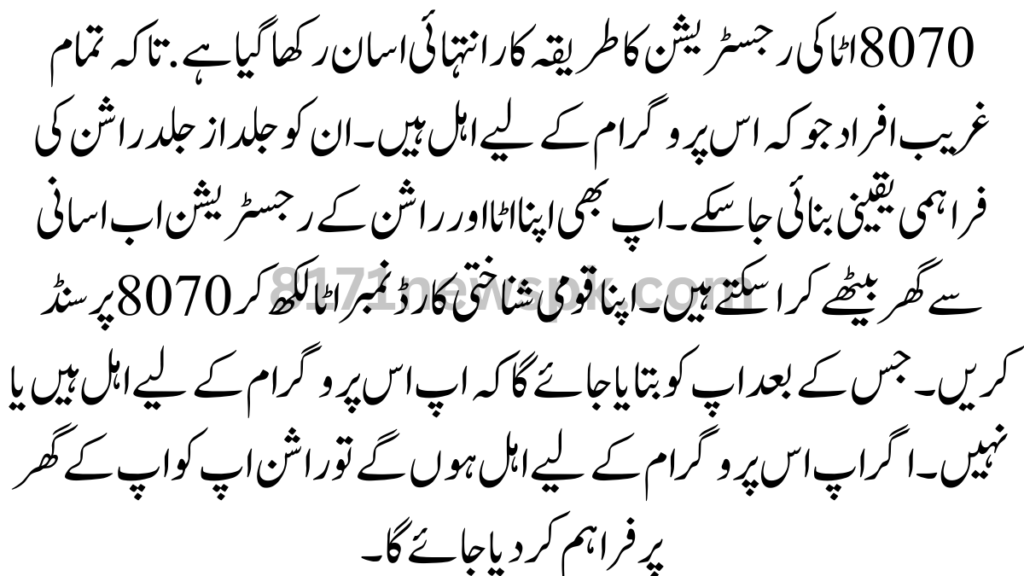 8070 اٹا کی رجسٹریشن کا طریقہ کار انتہائی اسان رکھا گیا ہے. تاکہ تمام غریب افراد جو کہ اس پروگرام کے لیے اہل ہیں۔ ان کو جلد از جلد راشن کی فراہمی یقینی بنائی جا سکے۔ اپ بھی اپنا اٹا اور راشن کے رجسٹریشن اب اسانی سے گھر بیٹھے کرا سکتے ہیں۔ اپنا قومی شناختی کارڈ نمبر اٹا لکھ کر 8070 پرسنڈ کریں۔ جس کے بعد اپ کو بتایا جائے گا کہ اپ اس پروگرام کے لیے اہل ہیں یا نہیں۔ اگر اپ اس پروگرام کے لیے اہل ہوں گے تو راشن اپ کو اپ کے گھر پر فراہم کر دیا جائے گا۔