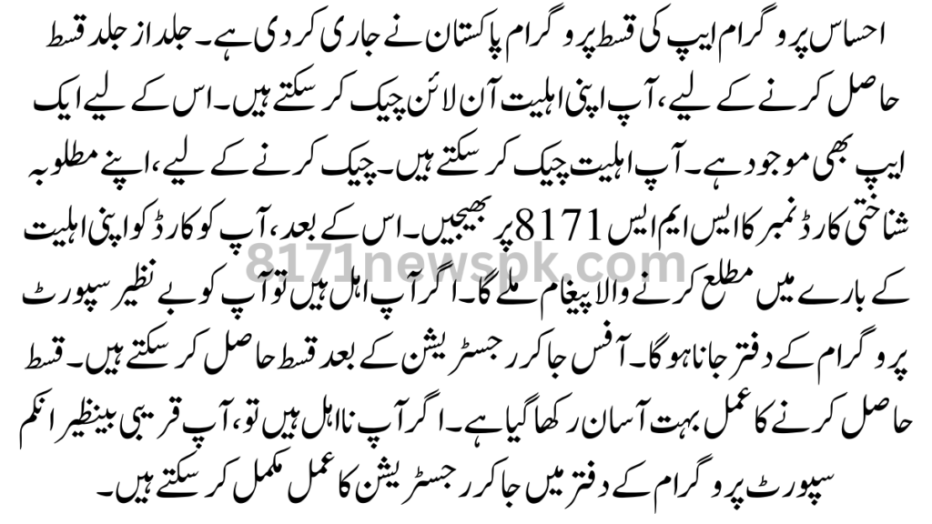 Ehsaas Program 2024 You can apply for it. After applying, you will be verified. After that, you will be issued the installments after the registration process is complete. Also, you can know about your eligibility by sending an SMS to 8171.