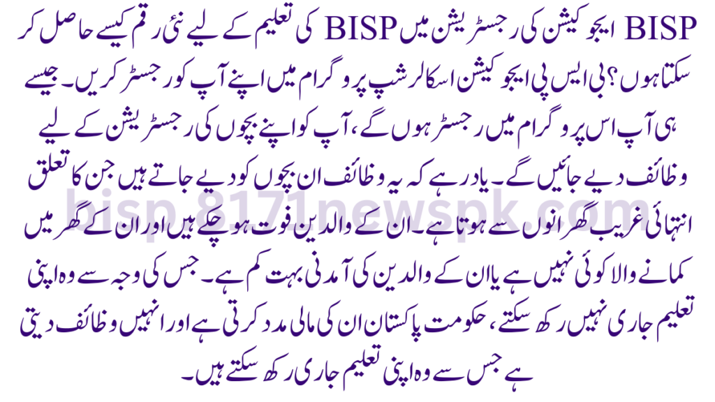 Registration of BISP Education; How can I get new money for BISP education? Register yourself in the BSP Education Scholarship Program. As soon as you register in this program, you are give the scholarships for the registration of your children. Remember that these scholarships are give to children who belong to very poor families.