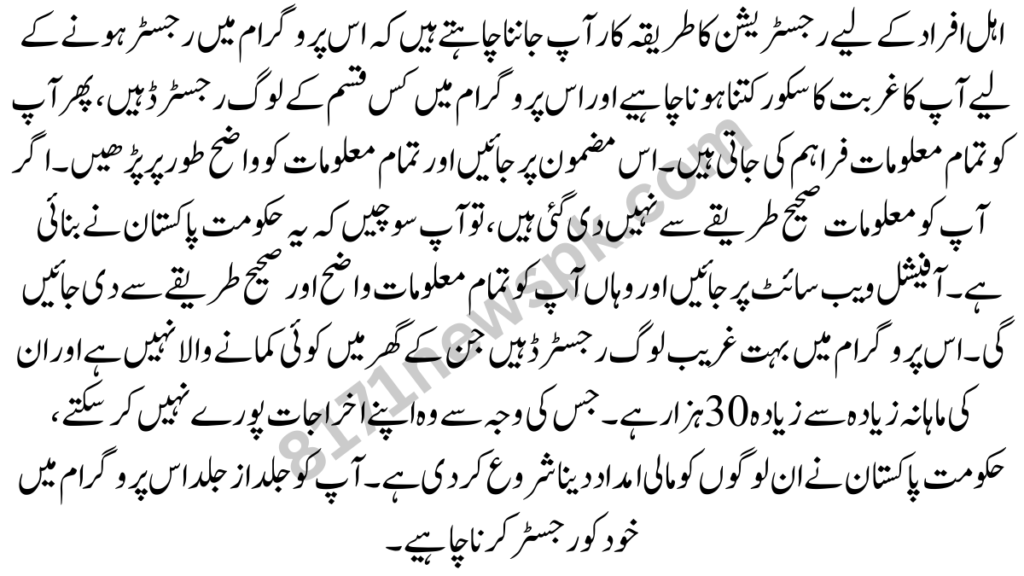 Registration Procedure for Eligible People you want to know how much your poverty score should be to register in this program and what kind of people are registered in this program, then all the information is given to you. Go to this article and read all the information clearly. If the information is not given to you correctly, then you should think that it was created by the government of Pakistan.