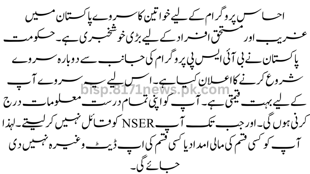 Women Survey for Ehsaas Program Great news for poor and deserving people in Pakistan. The government of Pakistan has announced to start of the survey again on behalf of the BISP program. So this survey is very valuable for you. You must enter all your correct information. And until you convince NSER. So you will not be given any kind of financial assistance or any kind of update etc.