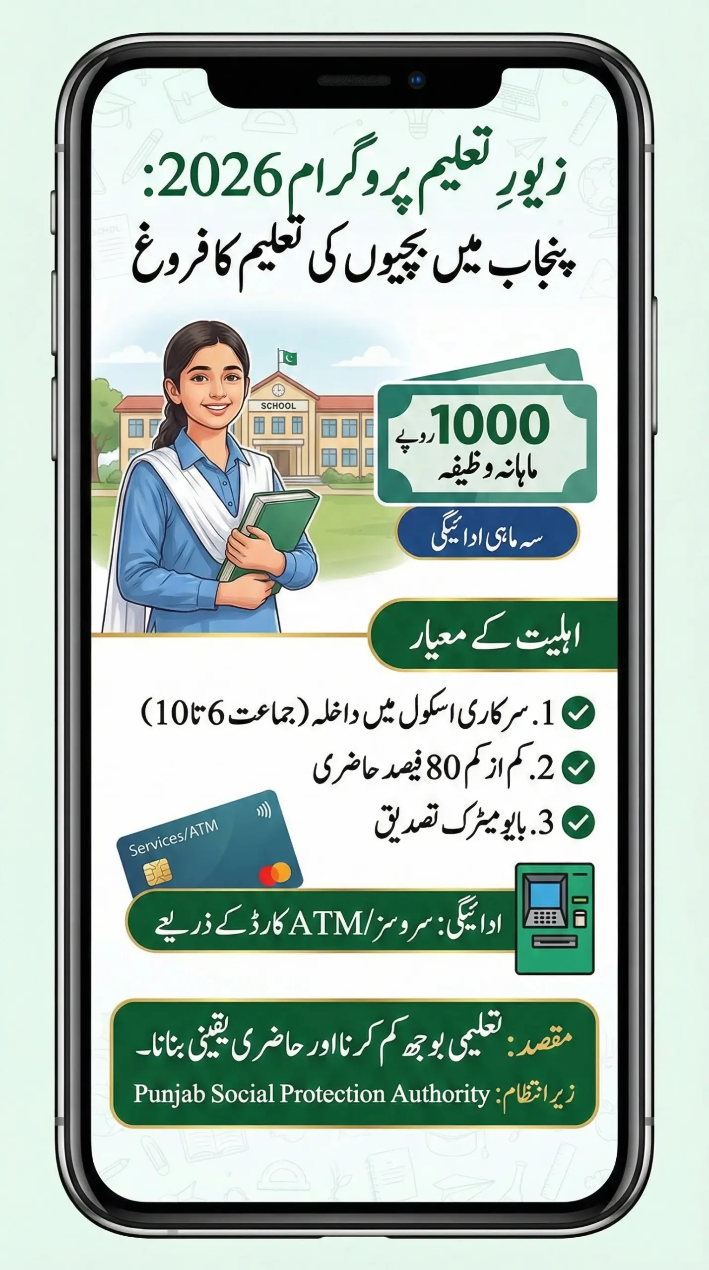 The Zewar-e-Taleem Program 2026 continues to support girls’ education in Punjab through a conditional cash stipend. Under the latest update, female students of Class 6 to 10 studying in government schools receive Rs. 1,000 per month, paid quarterly through a biometric ATM services card.